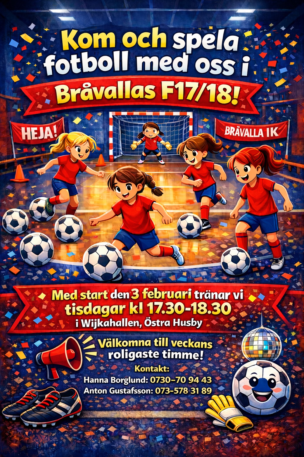 Tisdagen den 3 februari drar vi igång säsongen för Bråvallas F17/18-lag, och vi välkomnar alla tjejer födda 2017 och 2018 som vill spela fotboll. Det spelar ingen roll om man har spelat tidigare eller provar för allra första gången – alla är välkomna!